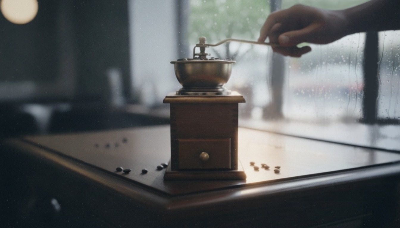 - Diegetic sounds: quiet room ambience · soft street noise · cup set down · coffee grinder hum · steam hiss