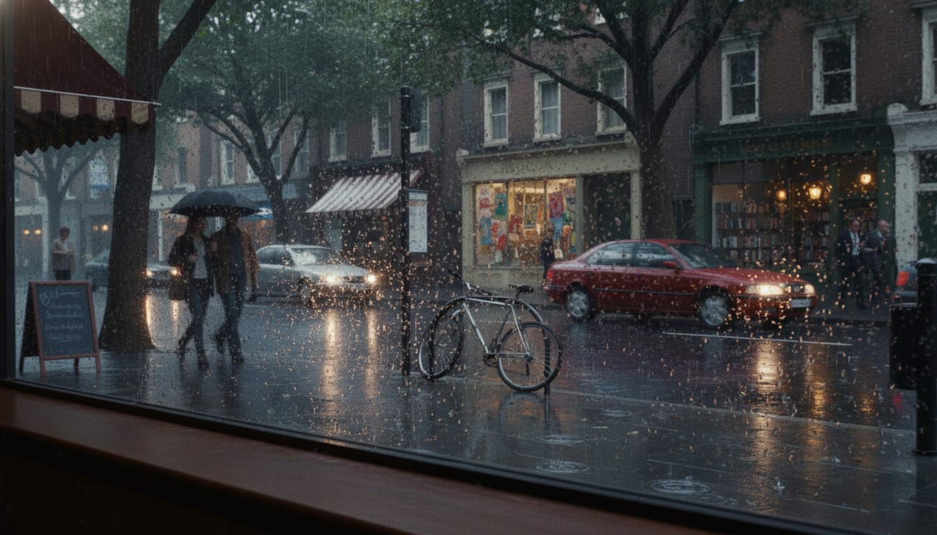 - Exterior: ≈5600K cool blue/grey — wet pavement reflections, diffuse sky light, muted saturation