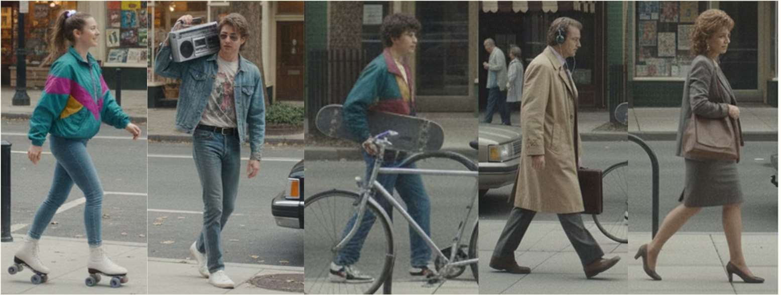 Each era character has locked continuity: clothing palette, props, movement rhythm and hairstyle stay consistent across all shots they appear in.