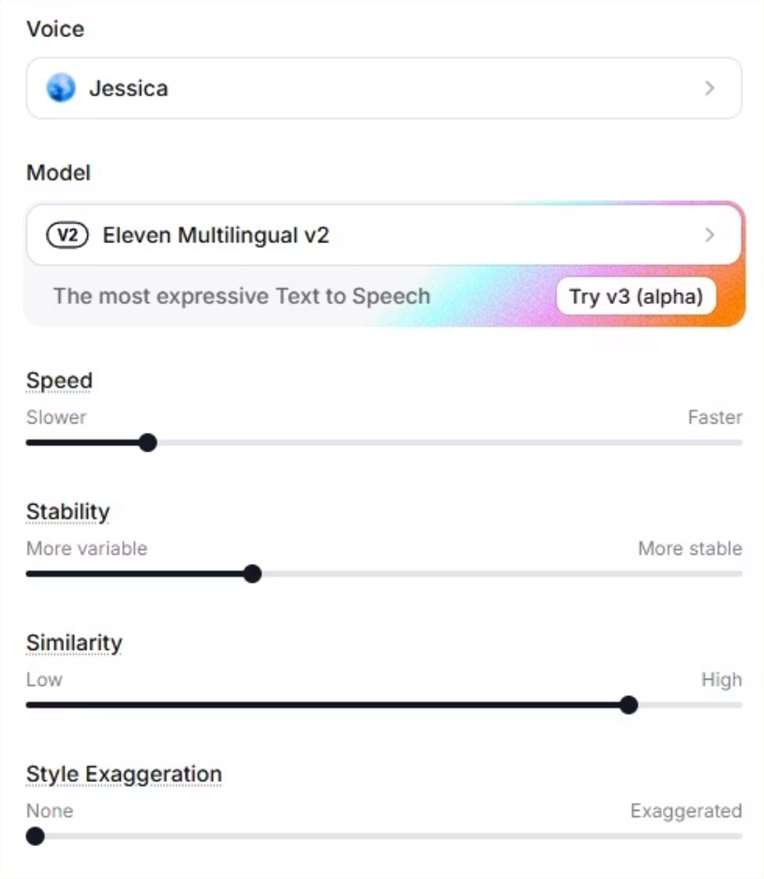 TTS settings (ElevenLabs): speed slightly below normal · softer voice onset · soft sibilants — Voice: Jessica, Eleven Multilingual v2