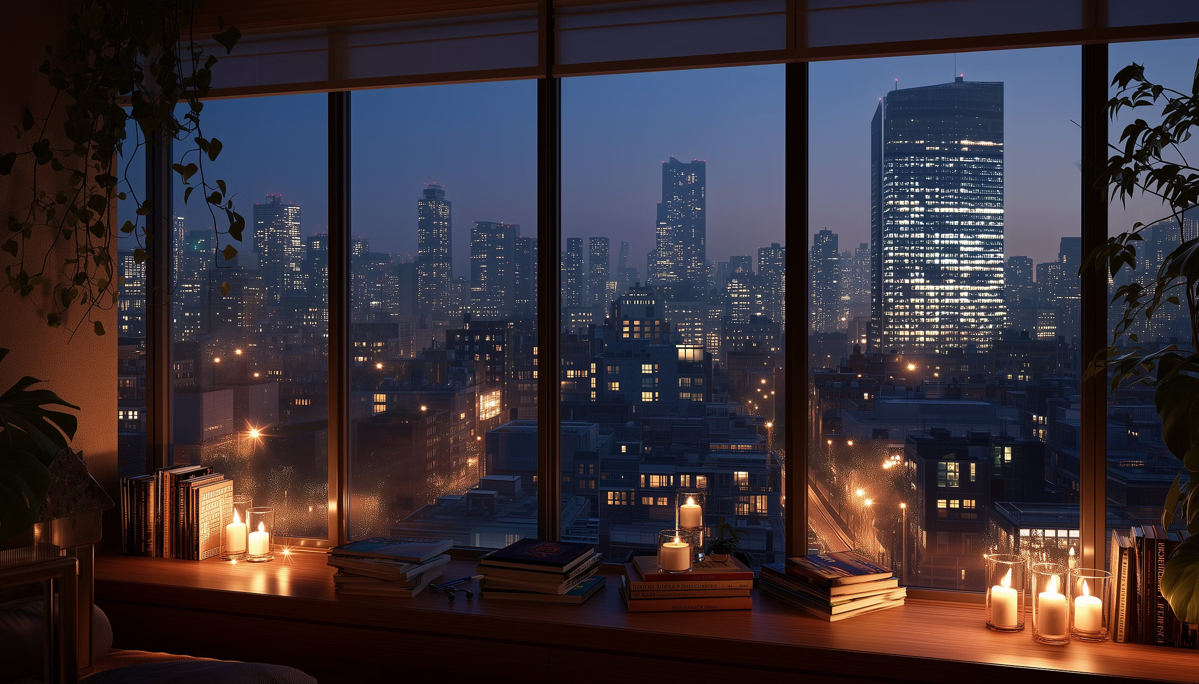 Ultra-realistic AI-generated interior — warm lighting, layered textures, plants, and books against a cold city backdrop. This visual tone defines the cozy channel's aesthetic: immersive, slow, and emotionally safe.